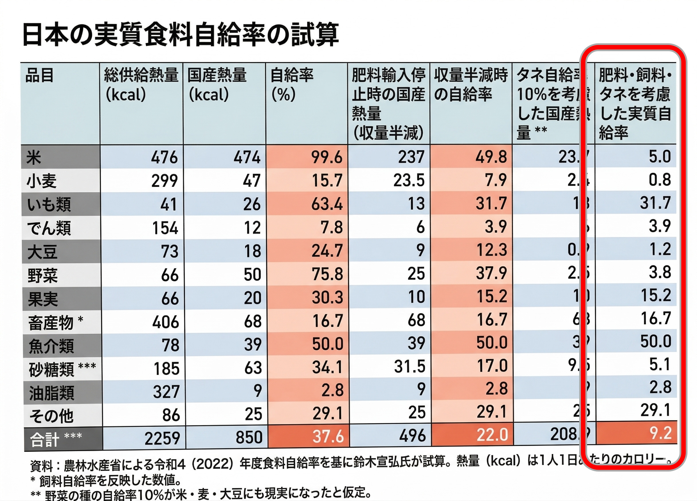 ホルムズ海峡の封鎖に直面し、エネルギー自給率の低さも勘案すれば、日本の食料自給率は実質数%しかないといっても過言ではない。