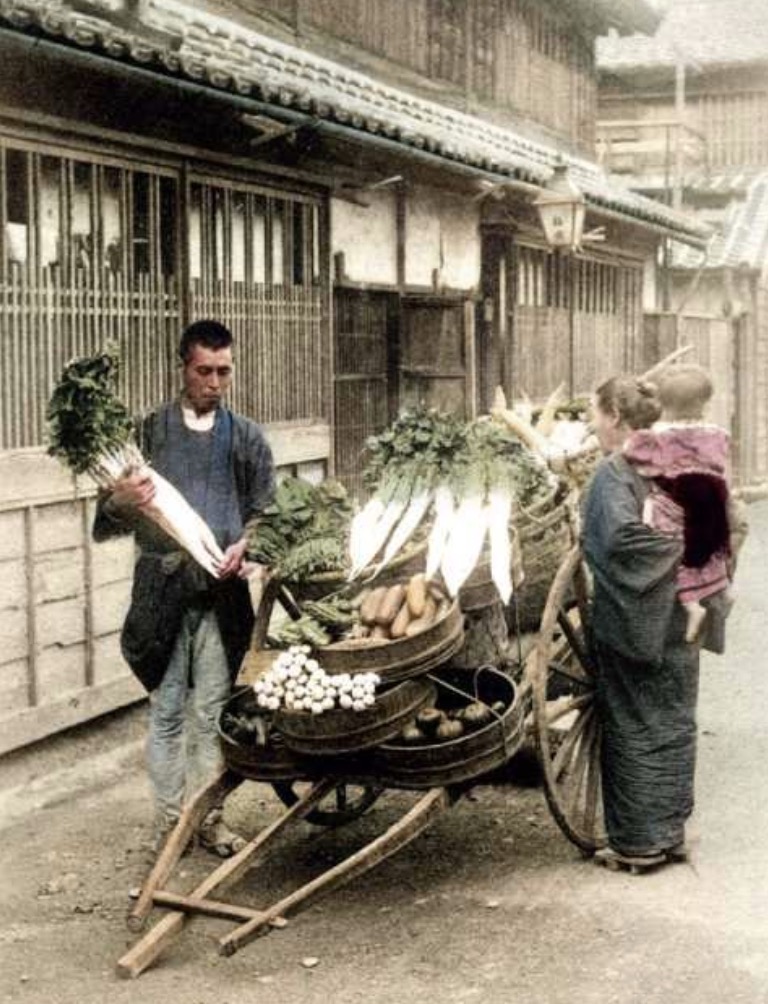 昭和初期にはこういう大八車で野菜を売りに来てた。