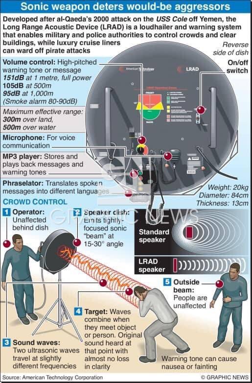 これは拡声・警告システムであり、軍や警察による群衆制御や建物制圧を可能にするほか、高級クルーズ船では海賊対策にも用いられている。—